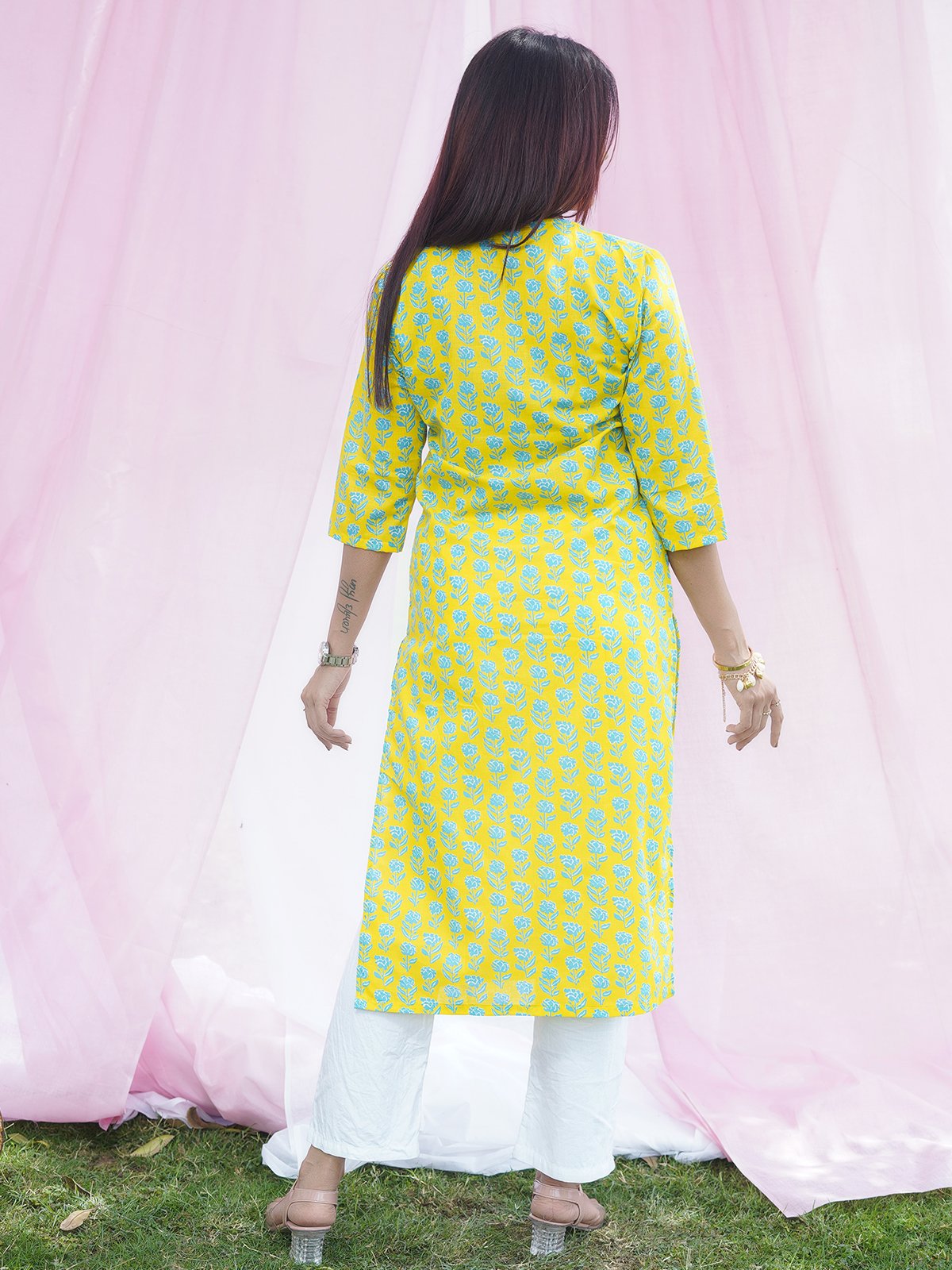 Refresh your wardrobe with this vibrant bright yellow floral printed cotton kurti set from Aimonly. Crafted in India using 100% pure cotton, this two-piece set is designed to uplift your everyday ethnic style. The kurti features a cheerful yellow base with subtle blue floral prints, a classic straight fit, and a round neckline with a keyhole detail for a touch of charm. Paired with a crisp white cotton bottom, this breathable and comfortable ensemble is perfect for work, college, or casual outings.