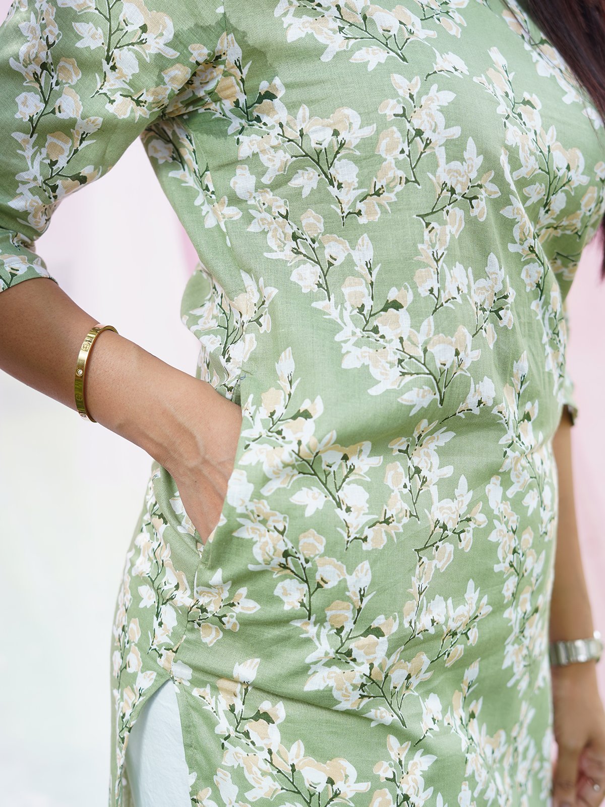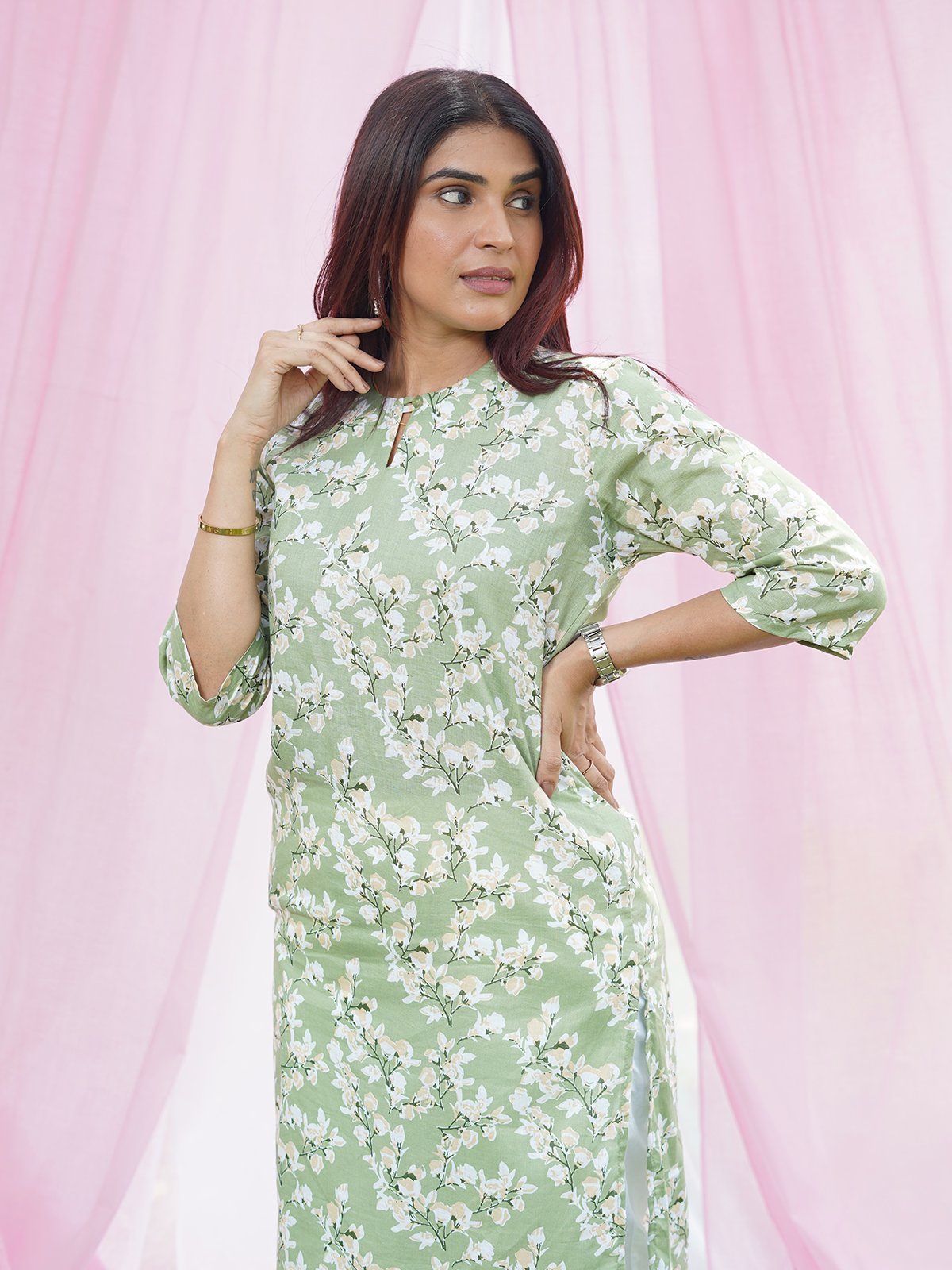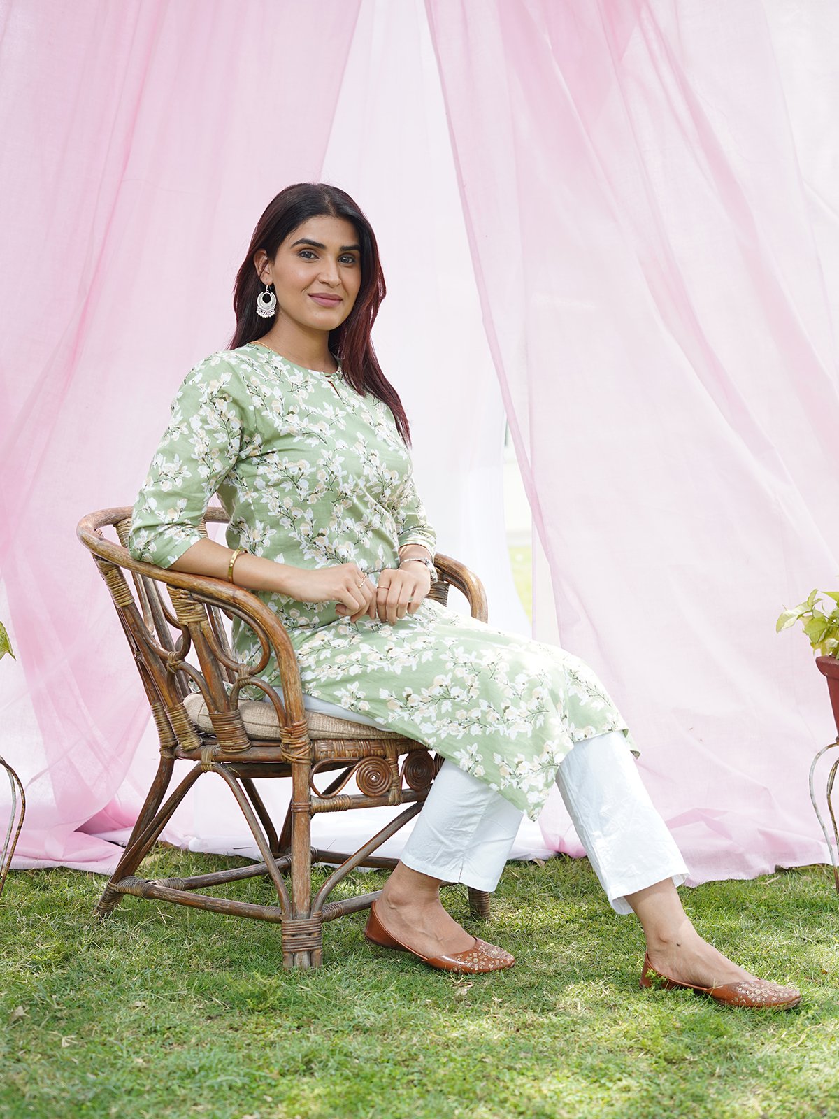 Step into serene sophistication with this elegant green floral printed kurti set by Aimonly. Crafted from 100% pure cotton, this two-piece ensemble combines breathable comfort with timeless style. The kurti features a soft pastel green base adorned with delicate white floral prints that exude freshness and femininity. Paired with a crisp white bottom, this set is perfect for both relaxed daytime outings and easy-going festive gatherings.